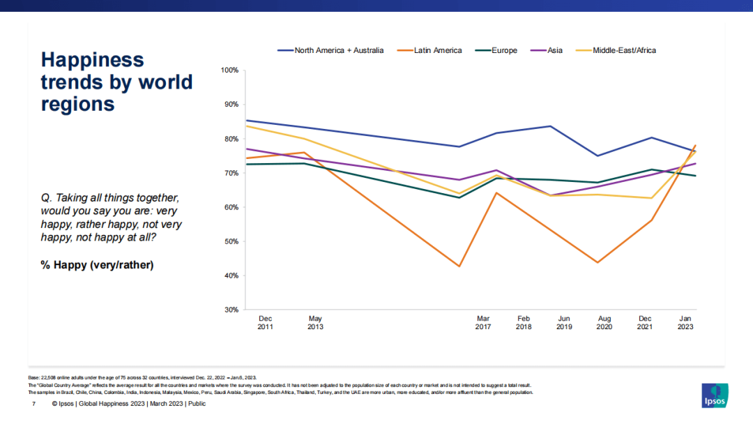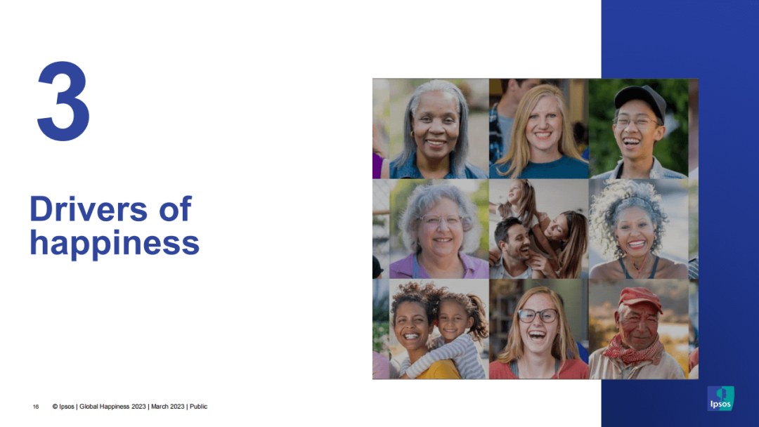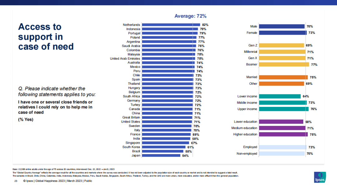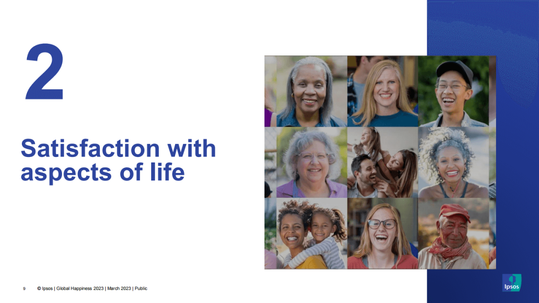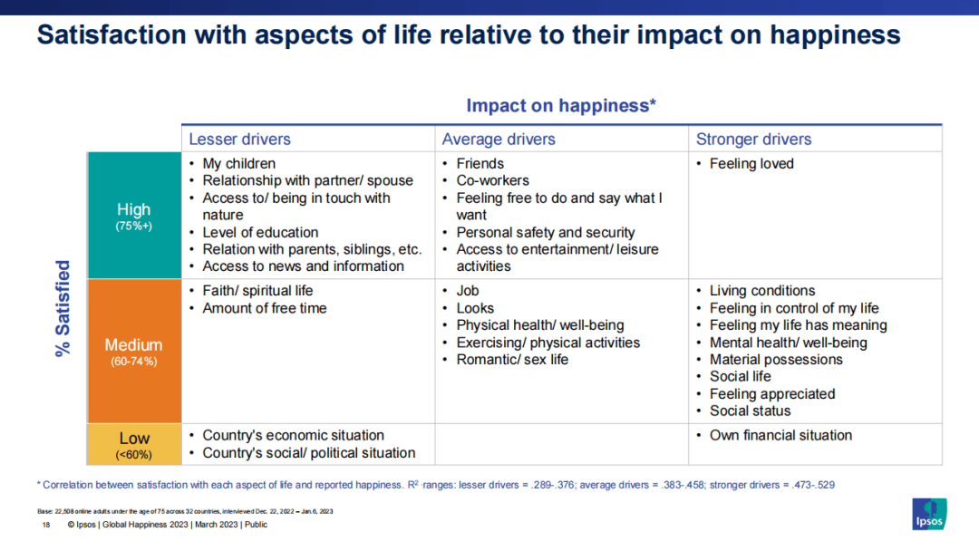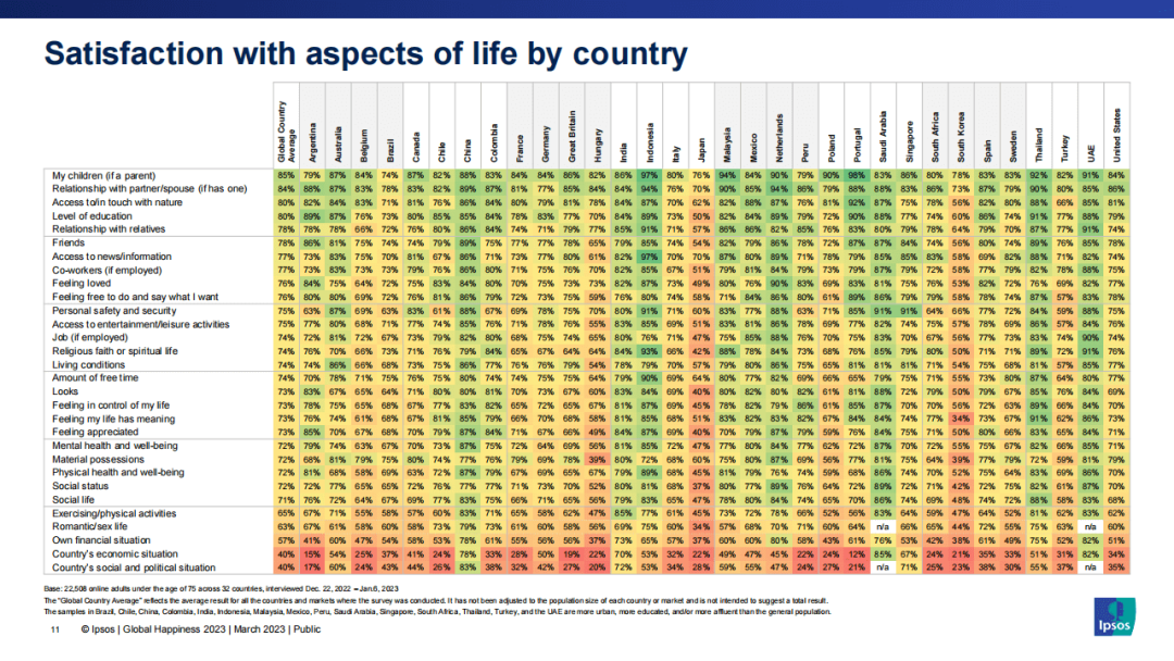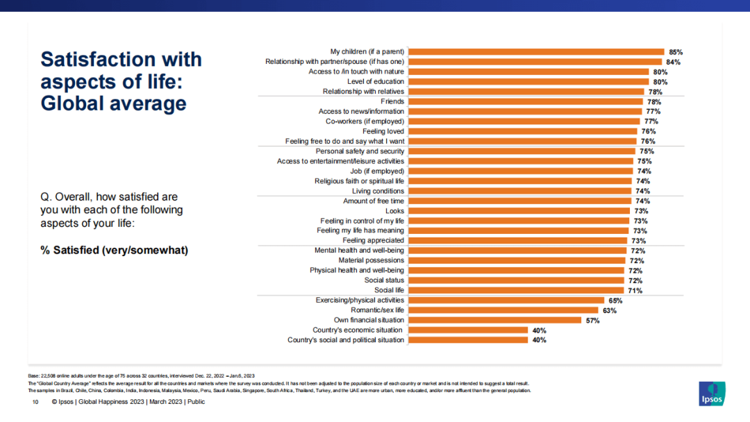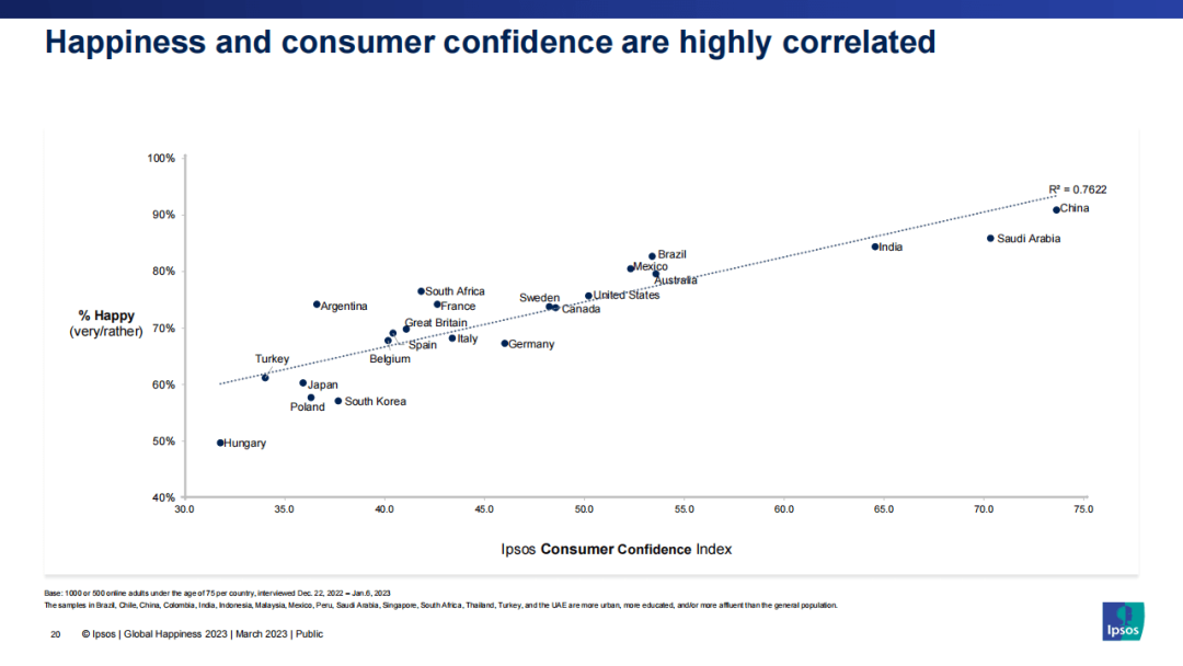 益普索(IPSOS)发布《2023年全球幸福指数》,怎么看中国以91%的最高幸福指数位居榜首?(附报告原文)国际民调机构益普索日前调查了全球各国的幸福指数,结果显示人们幸福感最高的国家前三是中国,有91%的人感到幸福;其次是沙特阿拉伯有86%的人感到幸福,第三名则是荷兰,有85%的感到幸福。该机构于2022年12月22日至2023年1月6日之间,对32个国家的22508名成年人调查得出的结果。结果显示,平均而言,在这32个国家中有73%的成年人认为自己“相当幸福”或“非常幸福”,其中人们幸福感最高的第4-10名依次为:印度、巴西、阿拉伯联合共和国、墨西哥、哥伦比亚、澳大利亚和智利。而在这32个国家中,幸福感垫底的是匈牙利、韩国和波兰。该调查报告还指出,今年全球平均幸福感较去年上升了6%;其中,比起高收入国家,中等收入国家的幸福感增长更为明显。在感到幸福的生活细则中,受访者对自己与家庭亲戚、朋友同事、大自然间的关系,感到满意;不满意的则是宏观经济走向、自身财务状况、爱情以及运动状况。B.Arch. in Architecture, National University of SingaporeGraduated 1976,Lives in Singapore新加坡国立大学建筑学士,1976年毕业,生活在新加坡