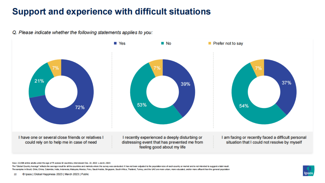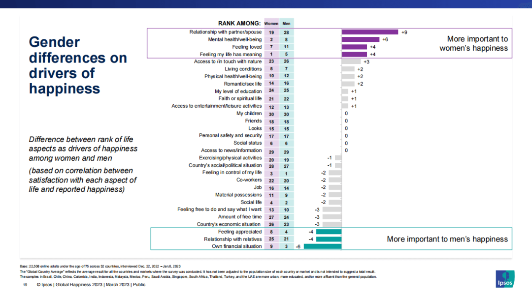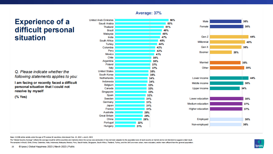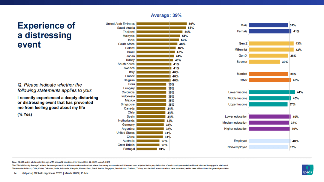 更不用说幸福是如何定义的了。我可以说,我在整个欧洲有很多熟人,在这样的调查中,很大一部分人会说他们很不幸福,因为他们不喜欢这个,他们不喜欢那个,他们可能有这个或那个,他们不支持现任政府或其他小事。他们并非生活在贫困中的人,而是过着非常好的生活,只是他们认为生活应该更好的心态非常强烈。有些人即使过着美好的生活,他们也喜欢抱怨事情不好,尤其是在我的国家,人们更容易这样做。此外,如果我不得不猜测的话,在过去3年里,许多国家/地区的人口数量都在下降,这可能是大流行造成的。另一方面,虽然有些人的生活状况要糟糕得多,但他们会说自己很幸福(也许不是“非常”幸福),因为他们喜欢现状,家人和朋友对他们来说已经足够了,即使他们拥有的不多。例如,虽然沙特阿拉伯是第二幸福的国家,但它也是在经历痛苦事件和困难的个人处境方面排名第二的国家。正如你所看到的,尽管发生了令人痛心的事件和困难的情况,他们仍然把自己的生活描述为幸福。不幸的是,这在数字统计中并不容易表现出来,因为这是人们对幸福的个人定义。这些都是有趣的统计数据,但将它们融入现实生活并不是那么简单。我认为在这种情况下,幸福的定义是拥有积极的外在。即使你个人正在挣扎,但知道情况会好转也足以保证幸福。而即使你面临的问题较少,但从经验和情感上看,消极的外表也会导致不快乐。看起来你比益普索的小伙子们了解得更多。你为什么不把你的“情报”告诉他们呢?如果91%的中国男性每晚都在哭泣,那么难怪“白人”国家(包括伪白人或想成为白人的国家)的男性每晚都会对自己疯言疯语!