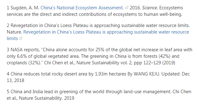 首先,我们必须记住,地球大气中的二氧化碳很少是由中国排放的。从18世纪开始,全球90%的二氧化碳都是由欧洲和美国排放的,中国是后来者:第二,中国比西方更早开始解决这一问题,西方等了200年才开始处理它们造成的污染,直到现在它们都还在拖拖拉拉。在2017年的一次电视讲话中,XI 89次提到环境问题,“我们希望我们的现代化是以实现人与自然的和谐共存为前提的,因为我们对自然造成的任何伤害最终都会由我们自己承担。清澈的水源和茂密的森林是无价之宝,我们必须在生态友好型社区中寻求一种简单、适度、绿色、低碳的生活方式”。他将七个机构合并为生态环境部,负责将决策扩展到整个自然生态系统中去,并承诺不通过投资或外交政策输出污染。新部门对整个黄河流域及其支流和湖泊在繁殖季节实施了为期三个月的禁渔令。为了发展“生态文明”,中国进行了广泛的生态改革,其生态系统正在迅速改善。黄土高原,这片25万平方英里的黄土地,到1902年(上图)已经失去了太多的植被覆盖,由于不断爆发洪水,干旱和饥荒,所以它被称为“中国的悲哀”。稀疏的植被、疏松的土壤和强烈的暴雨使它成为地球上受侵蚀最严重的地区,数十亿吨的黄色泥沙沉积,黄河因此得名。黄河治理,从1999年开始的一个试验点,到2019年,植被覆盖率增加了80%,泥沙沉积减少了90%。见下图:1978年,为了阻止戈壁沙漠的入侵,志愿者们开始种植上千亿棵树,他们创造了三千英里长的防风林——绿色长城。2011-2016年间,中国平均每年将石漠化面积减少1500平方英里,总共达到4万平方英里,沙漠地区的贫困率降低了1/5。到2018年,该地区种植树木达到700亿棵,沙尘暴的频率减少,森林覆盖率从19%上升到了25%。在经历了上世纪90年代的一系列水旱灾害后,试验点又推出了坡地和天然林两个新项目,发放了1000亿美元的生态补贴,将陡峭的农田退耕还林,它们发布了伐木禁令并建立了自然保护区。自2001年以来,全球新增绿叶面积相当于整个亚马逊雨林的面积,其中至少四分之一的增长来自中国。现在,林业部投资6亿美元修复了100万英亩的废弃农田,其中20万英亩目前没有投入种植,正在补充含水层、修复受污染的土壤、恢复生态系统和土壤盐碱化。以下是王建中的总结:中国六大林业重点项目覆盖全国97%的县,造林面积达到76万平方公里,它们的规模在世界和历史上都是无与伦比的。重点防护林建设项目(1978-2050年)包括三北防护林建设项目、长江中上游防护林建设项目、沿海防护林建设项目和平原农田防护林网络建设项目。三北防护林建设项目覆盖了中国西北、华北和东北13个省42%的国土。其主要目的是通过在农田和牧场周围种植防护林,以及在贫瘠的土地上造林来减少和控制中国北方的沙漠化和水土流失。2001年至2010年,该地区绿化面积达27.5万平方公里,据报道,其森林覆盖率已从5%提高到10%以上。这包括大量的公民参与,自1978年以来,中国公民共种植660亿棵树。到2050年,全国规划造林面积35.6万平方公里。2002年至2006年的投资总额达600亿元人民币。防护林带宽约250-550米,周边有围栏,植被种植呈棋盘状。“退耕还林”计划(2000-2020年,前一阶段为试点阶段)旨在将环境脆弱地区(如陡坡)的农田和荒地转变为森林以减少水土流失,控制洪水,并在中国中西部25个省份提供森林资源。改造后的土地一般位于产量较低的环境边缘地区(如沙地)。该计划在1999年至2012年期间共造林24.86万平方公里,目标是3200万户。2000年至2009年,对农民累计投资(粮食和农民现金补贴)1805.4亿元。2007年,中央决定将项目总投资增加到4300亿元。天然林保护计划(2000-2020)旨在保护和恢复天然林,增加森林资源。该项目覆盖了长江、黄河上游、东北和内蒙古的17个省份。2001年至2010年,新增森林面积达到4.4万平方公里,自然更新用地12万平方公里,森林管理和保护面积100多万平方公里,60多万退耕还林人员得到重新安置。国家重点林区已禁止天然林商业采伐,中国东北部和内蒙古的木材采伐量已从1997年的1824万立方米减少到1099万立方米。2000年至2010年该计划的总投资为1186亿元人民币,2010年至2020年的第二阶段计划拨款2440亿元人民币。京津地区沙化防治规划(2001-2023年)旨在通过多种方式减少北京及周边地区的沙化和沙尘暴,其中2001年至2012年期间,北京市共造林5.2万平方公里,植草2万平方公里,总投资218.4亿元。该项目覆盖了五个省。在32个省份实施的野生动物保护和自然保护区发展计划(2001-2050年)旨在通过扩大中国自然保护区网络,保护濒危物种和栖息地,覆盖面积达155万平方公里,约占中国陆地总面积的16%。2001年至2004年,该项计划的投资总额为15.7亿元人民币。重点地区速生丰产林基地建设计划(2001-2015年)旨在减少木材供应短缺。该计划覆盖中国东部18个省(年总降雨量≥400毫米)。目标是种植13万平方公里的速生丰产林,每年提供1.33亿立方米的木材——相当于中国商业木材消费量的36%,足以平衡目前约1.5亿立方米的供需缺口。在2007年之前,已经建成的林地面积达到4.9万平方公里。虽然很多其他关键林业项目都是由政府主导并由政府资助的,但该项目的主要资金来自商业部门。2004年总投资2.056亿元。资料来源:生物碳工程,英国皇家学会学报,生物科学——中国遏制森林覆盖损失的斗争,科学杂志,碳简报,美国科学院院报,自然立法会议——森林在