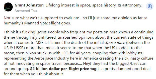 不是说你一定要有太空经验,但它确实有帮助。因为作为一名飞行员,你首先必须了解和理解航空航天工程学。