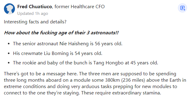 如何评价中国向新空间站送去了第一批航天员?背后有什么有趣的故事?1.What are some interesting facts and details behind China launching the first crew to their new space station?2.How do you evaluate that China launched 3 astronauts to the space station successfully?former Healthcare CFO,Lived in San Francisco1981–1988前Healthcare首席财务官,1981年至1988年生活在旧金山这一定传递了很多信息,因为这三个人将在离地球约380公里(236英里)的极端条件下的一个太空站上生活三个月的时间并从事非常艰苦的工作,为新的太空舱和他们待的空间站的连接做准备。这些都需要非凡的耐力。我一直认为去太空是年轻人的事情,他们会在45岁之前让你退休。