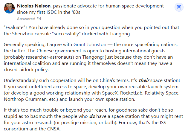 Lifelong interest in space, space history, & astronomy,Lives in Oklahoma City, OK终身对太空、太空历史和天文学感兴趣,生活在俄克拉荷马城我不知道我们应该评价什么-所以我只想分享我对人类载人航天的看法。我觉得这TMD太棒了。经常在这里看我帖子的人都知道我有一个持续的主题,我对当前的载人航天飞行(MSF)有未经过滤、毫不掩饰的看法,即我比大多数人更为最初的太空竞赛(美苏之间)的死亡感到惋惜。在我看来,当美国登上月球后,尼克松就把我们困在近地轨道困40年,再加上代表美国航空航天业的说客们制造了一种在太空旅行中不创新(not innovating)的恶劣文化,因为…他们有最大的/最好的骗局。想想看,每架航天飞机20亿美元的价格对他们来说是一笔非常好的交易。SpaceX通过早期的科幻概念带回了创新,并为我们提供了第一个(主要是)可重复使用的火箭。在我看来,只有当有人紧跟在他们身后或是像苏联在1957年那样让他们难堪的时候,美国才会推进太空旅行。不管怎样,我认为它(中国将3名航天员送入空间站)只会带来好处,因为要克服过去40年来人类(作为一个整体)在载人航天方面的长期停滞,我们需要不断创新,否则我们就永远无法继续前进。passionate advocate for human space development since my first ISDC in the '80s自从80年代我第一次参加国际空间发展战略以来,我一直是人类空间发展的热情倡导者“评价”?当你指出神舟飞船“成功”与天宫对接时,你已经回答了你的问题。总的来说,我同意Grant Johnston(译注:上一位答主)的观点——参与太空探索的国家越多越好。中国ZF对在天宫上进行国际合作(可能是研究人员-航天员)持开放态度。仅仅因为它们没有一个成立一个国际联盟而是自己在运作空间站并不意味着它们有一个封闭的合作政策。可以理解的是这种合作将需要符合中国的条件,因为这是它们的空间站!如果你想不受限制地进入太空,你可以开发自己的可重复使用的发射系统(或者与SpaceX、RocketLab、Relativity space、Northrop Grumman等建立良好的工作关系)并发射自己的空间站。如果你觉得太多的麻烦或超出了你的能力范围,看在上帝的份上,不要愚蠢到去说那些有一个空间站的人的坏话,这样的话你可能可以租一个空间站用于你的天文研究(或一些提高声望的任务或两者兼而有之)。目前,存在的选项只有国际空间站和中国国家航天局。English Editor (2009-present)左起:2021 年 6 月 17 日,在酒泉卫星发射中心,汤洪波 、聂海生和刘伯明在神舟十二号发射前的启程仪式上挥手致意。6月17日,神舟12号飞船成功对接在轨的天和核心舱,中国航天员聂海胜、刘伯明和汤洪波为祖国创造了历史,成为第一批进入中国空间站的航天员。他们是十几名精心挑选的航天员中的一员,他们将在两年内完成四次载人飞行任务,探索太空中的新天地。2019年12月,神舟12号、神舟13号、神舟14号和神舟15号的机组人员被选中后,神舟12号与这三名航天员一起完成了第一次任务。在神舟十二号任务中,57岁的聂海胜因两次太空飞行经验被选为队长,他是队里年龄最大的,出发前他把头发染成了黑色。现年55岁的刘伯明因之前在舱外活动中的经历而被选中;而46岁的汤洪波则是首次进入太空,早些时候他是神舟11号任务的后备航天员,他做了11年的后备。航天员的主要的选择标准基于几个方面,如经验、年龄、性格、身体表现和心理健康等,遴选过程还强调了三个不同成员之间的协同作用和相处。有趣的是,根据中国载人航天计划航天员系统副总设计师黄伟芬的说法,他们会对每位航天员进行大约43个方面的评估,包括年龄、身高、教育程度和专业背景等。被选中的三人还必须接受17次身体检查以测试耐力和对太空环境的适应能力。有趣的是,有120多个条款仅针对临床医学要求进行选择,而这些条款中的每一条都有候选人必须满足的多项医学要求。中国载人航天计划的一个团队还在医学、物理、心理学、科学和工程等各个领域开发了八个类别的100多种训练类型。神舟12号的航天员还进行了4小时的水下训练,穿上了200多公斤的宇航服以适应进行舱外活动任务的微重力环境。此外,航天员还进行了标准为8G的特殊的超重力或高重力训练,这意味着他们可以承受自身体重八倍的重力。航天员每半年需要通过一次这样的训练。中国第一批航天员团队包括14名成员,他们正在宣誓。2014年3月,第一批中国航天员中的五名退役,他们从未被选为进入太空的候选人。从那天起,他们将结束太空训练,他们的太空梦想将永远不会实现。三名中国航天员在太空中的首要目标是确保22.5吨重的天和核心舱投入使用,因为他们计划在最大直径为4.2米、离地球约380公里的天和核心舱上度过三个月时间。该核心舱全长16.6米,约五层楼高,可以为三名中国航天员提供了六个工作区、睡眠区、卫生区、餐饮区、保健区和锻炼区。除此之外,这三个人都有一个私人睡觉区和厕所,他们还可以享受跑步机、动感单车和阻力扩张器等设施以保持身体健康。上个月由无人天舟二号运送到天和核心舱后,三名航天员可以使用带有两个橱柜、微波炉、冰箱和饮水机的可折叠厨房。同一艘货船也为三人送去了太空食物,因为他们可以在太空品尝许多经典的中国美食。为航天员精心设计的高质量菜单拥有从主食到非主食,从肉类到蔬菜的许多令人垂涎三尺的美味佳肴。此外,