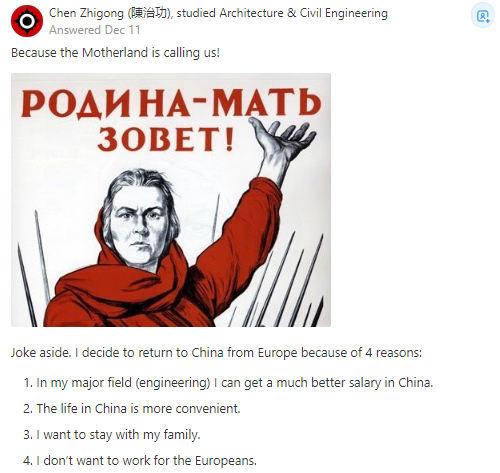 网文来自网友原文翻译投稿,所有言论皆不代表本站立场 | 本文文字/图片来自网络,侵删 | 点击页眉也可刷新 | 注册送50花瓣 | 每日登录送5花瓣 | 本文内容仅供娱乐,不作任何严肃之用途为什么越来越多的中国留学生选择回国,以至于留学背景不再吃香?本文译自Quora,原标题:What are the reasons more and more Chinese students abroad decide to return to China?