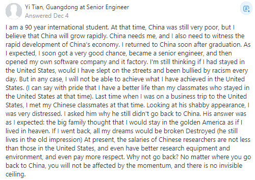 Guangdong at Senior Engineer我是一个上世纪90年代的国际学生。当时中国还很穷,但我相信中国会迅速发展。中国需要我,我也需要见证中国经济的快速发展,所以我毕业后不久就回了中国。如我所料,我很快就有了一个很好的成为一名高级工程师的机会,然后开了自己的软件公司和IT工厂。我一直在想,如果我留在美国,我会不会每天睡在大街上,被种族主义者欺负。但无论如何,我将无法实现现在取得的成就。(我可以自豪地说,我的生活比当时留在美国的同学要好)。上次我去美国出差的时候,我遇到了我的中国同学。看着他寒酸的样子,我很难过。我问他为什么还不回中国,他的回答和我预料的一样:家族里的人认为他会像生活在天堂一样呆在金色的美国。如果他回去,他所有的梦想都会破灭(他还活在老印象中)。目前,中国研究人员的工资并不低于美国,甚至有更好的研究设备和环境,还能得到更多的尊重。为什么不回去呢?无论你回到哪里,你都会受到这种势头的影响,你的上升通道也没有无形的天花板。