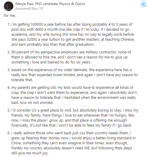 PhD candidate Physics & Optics在我做了4到5年每月4000美元且活得像条狗的博士后之后,如果幸运的话,我一年税前能拿到10万美元。如果我投身学术界,在这段时间里,我的妻子在每年支付3.2万美元的学费去获得另一个教授中文的硕士学位之前都无法合法地工作,而且毕业后的收入可能低于所付出的学费。我90%的潜在雇主是军事承包商,但它们谁也不被允许雇用我,所以我看不出我有什么理由放弃六年来我热爱和训练过的事情。根据我的年长的实验伙伴的经验,这里的体验确实低于预期。再说一次,我没有任何理由容忍这种情况。我的父母老了。我的孩子们会经历各种各样的不公,我不想让他们经历这些,而且我绝对没有理由容忍这种情况。当环境确实很糟糕的时候我犹豫了,但现在我不担心了。我认为美国是一个很好的旅游胜地,但呆在这里绝对很无聊。我会想念我的朋友,我的家人,我想念每当我饿的时候都有我喜欢吃的东西(就像现在)。我想念我成长的地方,而且那个地方给了我足够的经济支持,并不是说如果我回去我就无法养活我的家人。我真的很钦佩那些因为国家需要他们而回去的人,我从小就听他们的故事。现在,我将在中国享受更好的生活水平,这是他们那个时代甚至无法想象的。尽管坦率地说我的国家绝对不需要我,但追随他们的脚步仍然给了我很多快乐。我心中的理想主义仍然认为我可以把不喜欢的事情做得更好,即使我已经30多岁了,我也没有失去尝试的勇气。我妻子说得很对,我真的很浪漫。天下兴亡,匹夫有责。哈哈,我只是无法说服自己,因为这是我认同并感到有责任的地方。