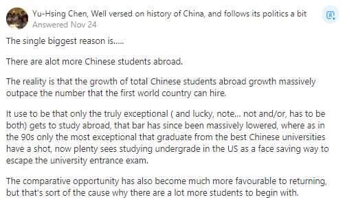 Well versed on history of China, and follows its politics a bit现实情况是中国留学生总数的增长大大超过了第一世界国家可以雇佣的人数。过去,只有真正优秀的人才(幸运的是,注意……不是和/或,而是两者都必须)才能出国留学,此后,这一门槛被大幅降低。在上世纪90年代,只有最优秀的中国大学毕业生才有机会,而现在很多人把在美国留学看作是逃避高考的一种方式。相对的机会也越来越有利于回国,这正是为什么有更多的学生要开始回国的原因。