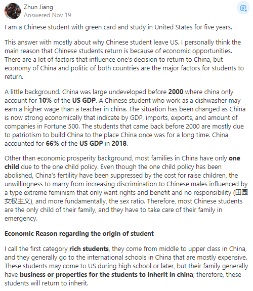 这个答案主要是关于中国学生为什么离开美国的。我个人认为,中国学生回国的主要原因是经济机会。虽然影响留学生回国决定的因素很多,但中国经济和两国政治是留学生回国的主要因素。一些背景:2000年以前,中国是一个未开发的大国,中国的经济实力仅占美国GDP的10%,在美国洗碗的中国学生的收入可能比中国的教师还要高。但随着中国经济的强劲发展,形势已经发生了变化,这一点可以从GDP、进出口以及财富500强企业的数量中看出。2000年以前回国的学生大多是出于爱国主义,他们想把中国建设成为中国曾经的样子。2018年,中国的经济实力占美国GDP的66%。除了经济繁荣的背景外,由于独生子女政策,中国大多数家庭只有一个孩子。尽管现在已经取消了独生子女政策,但中国的生育率却被抚养子女的成本以及受一种只想要权利和利益、不承担责任的极端女权主义(田园女权主义)影响的对中国男性越来越歧视的不愿意结婚等因素所抑制。因此,大多数中国学生是他们家的独生子女,他们不得不在紧急情况下照顾家人。我称第一类为富家学生,他们来自中国的中产阶级到上层阶级,他们通常在中国读国际学校,而这些学校大多很贵。这些学生可能在高中或之后来到美国,但他们的家庭一般都有生意或财产供学生在中国继承,因此,这些学生将返回中国继承财产和生意。第二类是知识分子,这些学生会在高中毕业后到国外学习,他们所学的专业是中国目前需求量很大的专业。中国政府出台了鼓励这些学生回国的计划,给他们开出了极高的工资和很多福利,比如全球专家招聘计划(千人计划)等。这些计划鼓励有才华的科学家或管理者和企业家回国,因为知识分子可以赚很多钱并使中国再次伟大(爱国主义)。第三类是移民,他们不会回来,因为他们的家人一心想离开中国。移民是指他们的大多数家人来到美国并在那里生活,但尚未成为美国公民的学生。移民可以是在美国出生的,因为他们的父母也可以返回中国并为他们获得中国公民身份,因为在中国,移民年满18岁时必须丧失一个公民身份。这些学生通常不想回到中国,因为他们全家都已经来了美国,这意味着他们在中国已经没有资源可以利用,必须在紧急情况下返回美国处理家庭事务。