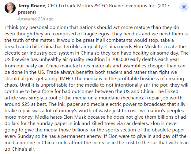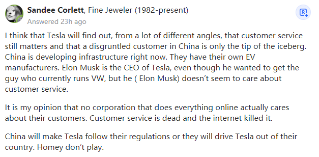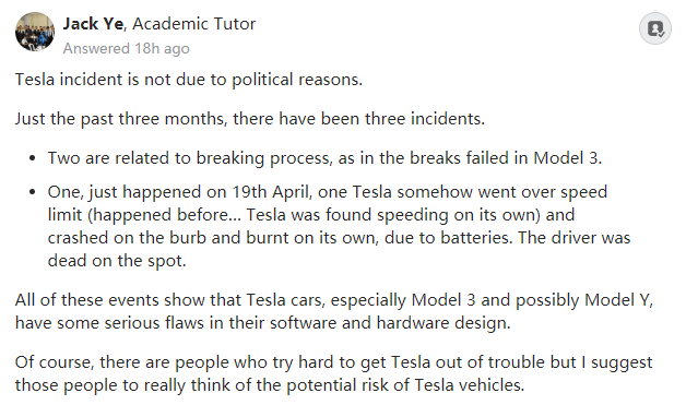 来源:https://www.quora.com/Do-you-think-criticism-by-the-Chinese-media-against-Tesla-will-gradually-dissipate-or-will-it-evolve-into-demands-that-the-company-be-subjected-to-increasing-pressure-from-the-Chinese-government-as-an-indirect