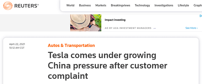 特斯拉公司(Tesla Inc.)周三在中国受到了监管机构和官方媒体的压力,此前,一名不满的客户周一在上海车展上提出的抗议被传开,迫使这家电动汽车制造商罕见地道歉。特斯拉在中国的销量占该公司全球销量的30%,它在位于上海的自己的工厂生产汽车。特斯拉被中国选中时正值美中关系持续紧张之际,其他外国公司遭到了强烈反对。“中国将继续向外国企业开放市场,但这并不意味着外国企业将获得任何特权,”中国官方报纸《人民日报》旗下的小报《环球时报》在一篇有关“特斯拉的失误(Tesla blunder)”的评论文章中说。周一,一名不满的顾客在上海车展上爬上了一辆特斯拉的车顶,抗议特斯拉处理她有关刹车失灵的投诉,引发了一场社交媒体风暴,监管机构和官方媒体也参与了进来。周三晚些时候,中国市场监管机构敦促特斯拉确保在中国的产品质量,而官方的新华社说特斯拉的道歉是“不真诚的”。《环球时报》写道:“该公司在公众面前表现出的傲慢和专横的姿态令人反感和无法接受,这可能对其在中国市场的声誉和客户群造成严重损害。”。特斯拉拒绝置评,但在一份声明中表示将与监管机构分享有关刹车事件的数据,此前当地监管机构要求特斯拉提供刹车事件数据。在周一上海车展的视频中,一名身穿印有“刹车失灵”字样T恤的女子大声发出类似指责,而工作人员和安保人员则努力使其恢复平静。特斯拉周二就没有及时处理投诉向中国消费者道歉,并表示将对其在全球最大汽车市场的服务业务展开审查。不过,新华社说特斯拉的道歉缺乏诚意(fell short)。“再大的企业,也要有敬畏的意识;再小的问题,也要有正确的态度。傲慢是要付出代价的,没有一家公司可以为所欲为。”该公司在周三晚间的一篇评论中说。“如果一家公司出现问题时不整改,如果不更换出问题的高管.....它最终会再次犯错”。本周一,特斯拉副总裁陶琳(Grace Tao)对当地一家媒体表示“特斯拉不可能妥协”,并表示她怀疑有人让这位客户参与抗议,这次采访引发了官方媒体对特斯拉“傲慢”的指责。与此同时,《环球时报》发表了一篇报道,报道称一辆特斯拉汽车发生了致命事故,事故“周三在网上被披露”,并称这进一步引发了对特斯拉质量控制方面的担忧。消息人士告诉路透社,上个月特斯拉(Tesla)在中国受到了审查,当时军方以其车内摄像头存在安全隐患为由,禁止其汽车进入其建筑群。本月早些时候,特斯拉表示其车内的摄像头在北美以外地区不会启动。中国网民上个月开始呼吁抵制包括H&M,阿迪达斯和耐克(Nike)在内的品牌,因为它们在过去的声明中称它们将不再使用来自XJ的棉花。一些研究人员和外国立法者(foreign lawmakers)说XJ使用强|制|劳|动来满足季节性需求,而中国对此予以否认。