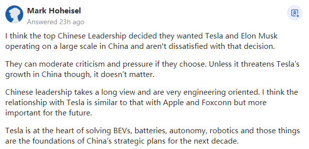 如果他们愿意,他们可以缓和对特斯拉的批评和压力。除非这种批评和压力威胁到了特斯拉在中国的发展,否则这并不重要。中国领|导|层着眼长远并且非常理性,我认为他们和特斯拉的关系类似于苹果和富士康的关系,但相对而言特斯拉对未来更为重要。特斯拉是解决纯电动汽车、电池、自动化、机器人科学等问题的核心,这些都是中国未来十年战略规划的基础。