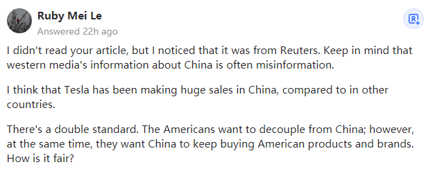 我认为与其他国家相比,特斯拉在中国的销量一直很高。这里面存在双重标准。美国人想与中国脱钩,然而与此同时,他们又希望中国继续购买美国的品牌和产品。这样公平吗?