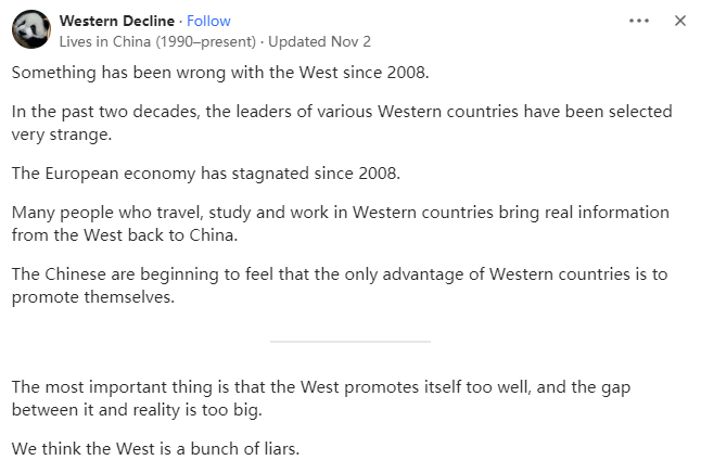 Lives in China (1990–present)在过去的二十年中,每个西方国家被选出来的领导人都非常外行。许多在西方国家旅行、学习和工作的人将西方的真实信息带回了中国。中国人开始觉得西方国家的唯一优势就是自我推销做得好。最重要的是西方把自己宣传得太好了,以至于它与现实之间的差距太大了。不过西方人会说,只有一部分人是这样,大多数人是好的。