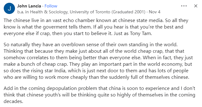 b.a. in Health & Sociology, University of Toronto (Graduated 2001)中国人生活在中国官方媒体的巨大的回音室中,所以他们只知道政府告诉他们的事情。如果你听到的都是你是最棒的,其他人都是垃圾,那么你就会开始相信这一点,就像Tony Tam一样。