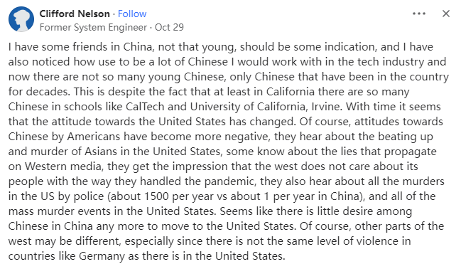 Former System Engineer,BS from University of Chicago我在中国有一些没那么年轻的朋友,(提问者所说的)应该是一种迹象,我也注意到我曾经和很多中国人在科技行业一起工作过,但现在年轻的中国人没有那么多了,只剩下在这里待了几十年的中国人。尽管如此,至少在加州,加州理工学院和加州大学尔湾分校等学校里仍有许多中国人。随着时间的推移,他们对美国的态度似乎发生了变化。当然,美国人对中国人的态度也变得更加消极,以至于中国人听说了在美国殴打和谋杀亚裔的事件,一些人还了解了西方媒体上传播的谎言,他们得到的印象是西方处理疫情的方式显示它们并不关心自己的人民,他们还听说了美国所有的警察谋杀案(美国每年约1500起,中国每年约1起)以及美国所有的大规模的谋杀事件,这使得在中国的中国人似乎再也不想移居美国了。当然,西方其他地区可能有所不同,尤其是暴力程度与美国不一样的德国等国。