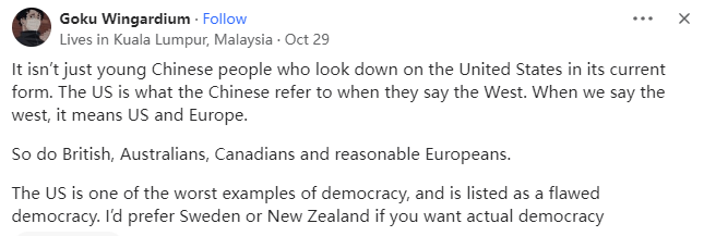 Lives in Kuala Lumpur, Malaysia年轻的中国人看不起的不只是美国的现状,中国人说美国时所指的是西方。当我们说西方时,它意味着美国和欧洲。