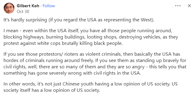 我的意思是即使在美国国内,也有很多人在为抗议白人警察残忍杀害黑人而四处奔走,堵塞高速公路,焚烧建筑物,抢劫商店,毁坏车辆等。如果你把那些抗议者/暴徒视为暴力罪犯,那么基本上美国有成群的罪犯在自由地活动。如果你认为他们是在勇敢地站出来捍卫公民权利,好吧,他们的人数那么多,又那么愤怒——这说明美国的公民权利出现了严重的问题。换句话说,不仅仅是中国的年轻人对美国社会的评价很低,美国社会本身对美国社会的评价也很低。