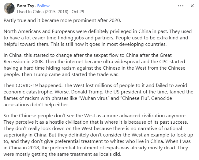 Lived in China (2015–2018)过去,北美人和欧洲人在中国确实享有特权,他们过去更容易找到工作和伴侣,人们过去对他们格外友善和乐于帮助他们。现在大多数发展中国家的情况仍然如此。在中国,这种情况在2008年大衰退后的sexpat(译注:sex(性)和expat(移居的人))流入中国后开始发生变化。随后互联网变得极为普及,以至于很难向中国人民隐瞒西方针对中国人的种族主义。然后特朗普上台并开启了贸易战。随后发生了新冠肺炎,西方为此失去了数百万人并且未能避免经济灾难。更糟糕的是当时的美国总统唐纳德·特朗普用“武汉|病毒”和“中国|流感”等短语煽动种族主义。种族|灭绝指控也让这一切雪上加霜。