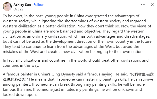 确切地说,在过去,中国的年轻人夸大了西方社会的优点,而忽视了西方社会存在的缺点,他们将西方文明视为更好的文明,但现在他们不这么认为了。现在,中国年轻人的观点更加平衡和客观。他们将西方文明视为一种既有优点也有缺点的普通的文明,也不将其作为自己国家未来的发展方向。他们倾向于继续学习西方的优点,但避开西方犯下的错误,并创造属于自己国家的新文明。