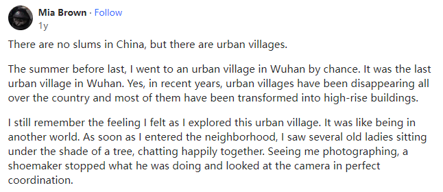 前年夏天,我偶然去了武汉的一个城中村。这是武汉最后一个城中村,是的,近年来,全国各地的城中村都在消失,其中大部分都被改造成了高层建筑。我仍然记得我在探索这个城中村时的感受--就像身处另一个世界。我一进村,就看到几位老太太坐在树荫下愉快地聊天。看到我在拍照,一个鞋匠停下了手中的工作,神情协调地看着镜头。清洁工也倾向于在业余时间聊天,比如“你吃饭了吗?”当我走进那里的市场时,我真的很震惊。叫卖声、讨价还价、笑声交织在一起,我敢打赌,没有人不喜欢这样和谐、活泼的气氛!当你经过摊位时,摊主会叫你买一些新鲜的蔬菜。我喜欢去市场看水产区,那里有各种各样的海水鱼和淡水鱼。鱼贩子擅长杀鱼,他可以在一分钟内完成工作。小贩们甚至会在市场上打麻将。哈哈。当有客人时,他们会告诉牌友先等一下,办完事后尽快回来继续打麻将。我忍不住会想,这些人一定很幸福吧?他们脸上的笑容似乎是生活满足的标志。每个人对我这个陌生人都很宽容,没有人投下不友善的目光,所以我可以背着相机继续漫步。这个街区很大,老建筑很密集,沿街有各种各样的商店,人们来来往往。大楼外挂着很多空调,不时滴水。架空的电线交叉在一起,遮住了一部分天空。下午,气温逐渐升高,兴奋的气氛逐渐平静了下来。街道变得很安静,因为每个人都在小睡。我深入社区,就像一次冒险。这里历史悠久,很多墙壁已经开始剥落,到处都是招聘和销售药品的广告。在一条狭窄的小巷里,我看见一位老人靠在摇椅上看书。一股凉风从小巷吹来,搅动了他的书页。我开始有点羡慕他了。我还注意到这附近有很多监控摄像头,因为这是一个开放的社区,生活在这里的大多数人都是流动人口,而且社区规模很大,存在很多盲点,所以监控摄像头是安全和管理所必需的。据了解,这里治安状况良好,几乎没有发生大的案件。事实上,我真的很喜欢这种人性化的地方。各种各样的人从全国各地来到这里,从武汉本地的居民到新来城市的上班族都有,他们负担不起城市中心的租金。他们是清洁工、理发师、鞋匠、程序员,也许还有街对面的邻居。这里的人们互相依靠,彼此坦诚相待。在经历了疫情之后,再看看这些照片,我明白了这种平凡而温暖的生活是多么珍贵。走出城中村后,我发现周围都是高楼大厦。街道宽敞整洁,建筑繁荣精致。我甚至开始怀疑自己是否穿越到了另一个时代。中国人从不认为这些城中村是贫民窟,也不认为生活在其中的人是穷人和受歧视的人。每个人都是平等的,唯一的区别是他们住在一所旧房子里。在今天这个时代,这种复古文化消失得如此之快,以至于当我们遇到它时,我们甚至会认为它是一件艺术品。