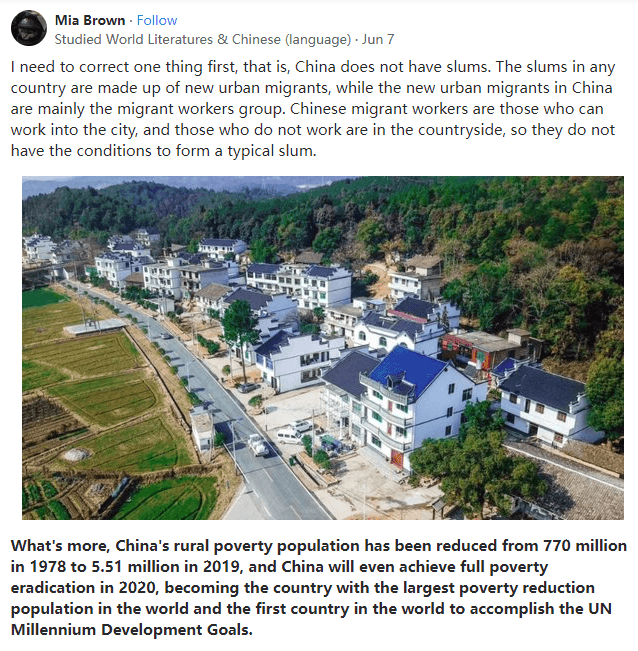 Studied World Literatures & Chinese (language)首先我需要纠正一件事,即中国没有贫民窟。所有国家的贫民窟都是由城市新移民组成的,而中国的城市新移民主要是农民工群体。中国的农民工指的是那些能够进入城市工作的农民,而那些不在城市工作的农民都生活在农村,因此中国不具备形成典型的贫民窟的条件。此外,中国农村的贫困人口已从1978年的7.7亿减少到2019年的551万,到2020年,中国甚至实现了全面消除极端贫困并成为世界上减贫人口最多的国家,同时也是世界上第一个实现联合国千年发展目标的国家。有人可能会说中国的农村和城中村是落后和贫穷的代表,但事实并非如此。相反,中国有许多农村地区是中国传统文化遗产的聚集地,传统的乡村遗产在这里得到了修复和改造,以激发活力并保护和发展乡村文化。例如,浙江省丽水市松阳县就是一个完整的“中国古典”县城,被《中国国家地理》誉为“江南最后的秘境”。许多新农村保留了原有的建筑特色并充分利用了当地的地理位置、可持续发展的材料等,因此受到了国内外游客的欢迎。以碉楼和藏寨闻名的丹巴藏寨和保留原生态特色的少数民族村寨喀纳斯图瓦村是中国每年吸引数百万游客的特色村落。它们为地方经济的发展带来了巨大的流量,也促进了传统文化的发展和传承。中国的新农村除了发展成为旅游村落,也在进行全面的产业调整和优化,科技、环保等理念也被引入农村。2020年,农村居民的人均可支配收入达到17131元。农村的内部治理还引入了社区的概念,将中国传统的风土人情与互联互通的未来社区结合了起来。这不仅创造了“同一屋檐下”的身份,更让人们从空间层面走出来,进行公共软治理,从而逐步孵化出未来的乡村社区模式。我强烈建议你去这些地方亲眼看看,这样你会有更直观的感受。毕竟,中国的风景和文化是无与伦比的。说完中国的农村,我再来说说经常被外媒歪曲报道的城中村。就地理位置而言,中国的城中村位于城市中。中国的城中村是在城市的建设和扩张过程中,由于开发成本高昂而被遗留下来的。而在贫民窟普遍存在的印度和拉丁美洲,贫民窟会随着城市的扩张而增长,并且大多位于城市之外。在环境方面,亚洲最大、世界第二大的贫民窟达拉维,满大街都是赤身裸体的孩子和流浪狗,日常生活更是艰难。女人只能在死水池里洗衣服;如果需要喝水,必须步行2公里到“黑市”买水。在达拉维,平均有 1440 人共用一个厕所,人们会在路边的小巷里随意大小便,停电停水更是家常便饭。而中国的城中村虽然不算太大,但周边配套和治安都不错,教育、医疗、交通条件也不算太差,软硬件都比贫民窟好很多。众所周知,贫民窟的犯罪率和死亡率普遍很高,而被称为屎坑的东圣路易斯(译注:East St. Louis,美国伊利诺伊州圣克莱尔县的一座城市)在2013年和2016年是该国城市中谋杀率最高的,暴力犯罪率也更高(超过全国平均水平的十倍)。但这些在中国的城中村是不可能发生的。此外,如果将重点放在生活在那里的人身上,差异可能会更加明显。贫民窟是大量廉价劳动力的聚集地,大多数生活在贫民窟的人都是因破产而失去生计的人。他们在大城市工作,但付不起房租,因此只能在城市周围搭建自己的棚屋或房屋,这些人包括流浪汉、妓女、皮条客和偷渡者等。如果说贫民窟意味着堕落和失败,那么中国的城中村可能对应着希望和开始。对许多人来说,中国的城中村是许多人融入城市的跳板,为城市的新来者提供了一个廉价便捷的地方。城中村已成为农民工的梦想起点和农民市民化的中转站。同样,城中村也是城市发展的跳板,现在有许多研究指出城中村在降低经济成本、传承历史文化和丰富社会生态方面的价值。城中村作为一种有特色和灵活的城市空间,也具有抵制城市空间充分商业化的价值。与美国相比,我们可以更深入地了解中国城中村的价值。在美国,穷人过着没有尊严的生活,他们几乎没有翻身的机会。他们没有固定住所,在里士满,每年约有3000户贫困家庭被驱逐。只要承租人拖欠租金5天,房东就有权驱逐他们。否则,警察会带着枪来到门口。他们看不起病,每年约有60万至100万美国人因无力支付医疗费用而破产。因此,不难理解为什么洛杉矶这个富人云集的地方同时也是美国无家可归者的聚集地。在过去的几年中,洛杉矶无家可归者的人数从33000人飙升到了59000人。在美国3.3亿人口中,约有55.3万流浪者和4000万穷人,穷人占到了总人口数的12%。所以,我想你应该问的是“美国最危险的贫民窟是哪里?”