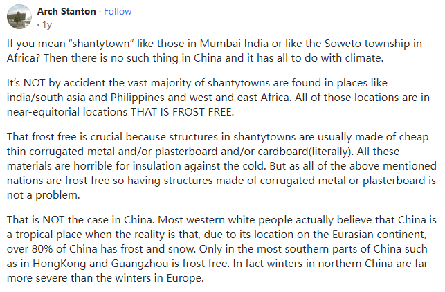 世界上绝大多数贫民窟都位于印度、南亚、菲律宾、西非和东非等地,这并非偶然。所有这些地点都在接近赤道的地点,那里没有霜冻。无霜冻是至关重要的,因为贫民窟的建筑通常由廉价的铁皮和/或石膏板和/或硬纸板(字面意思)建造,所有这些材料都很难隔热御寒。但由于上述所有国家均无霜冻,因此采用铁皮或石膏板制成的建筑不存在问题。而中国的情况并非如此。虽然大多数西方白人认为中国是一个热带国家,但事实是由于中国位于欧亚大陆,中国超过80%的地方都有霜雪。只有在中国最南部的地区(如香港和广东)才是无霜区。事实上,中国北方的冬天远比欧洲的冬天更寒冷。试图依靠由铁皮或纸板建成的建筑在霜冻中生存是不可能的,因为你会在睡眠中死于低温,这就是为什么中国传统上没有贫民窟的原因。中国没有贫民窟的另一个原因是中国根本不允许贫民窟的存在,如果有贫民窟建成,中国会拆除任何此类建筑区。中国甚至不喜欢“城中村”和破旧(但建筑结构牢固)的农村建筑,因此,它们正在实施一项建造公寓群的大型计划以便让人们离开城中村和破旧的农村建筑。