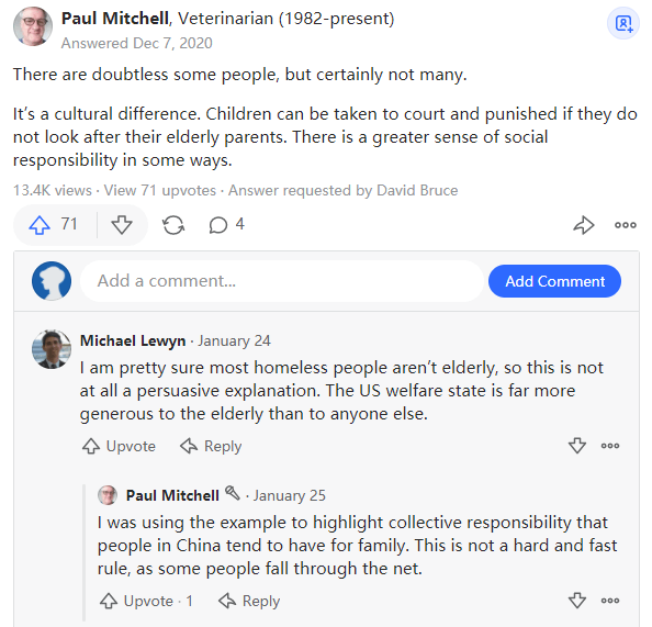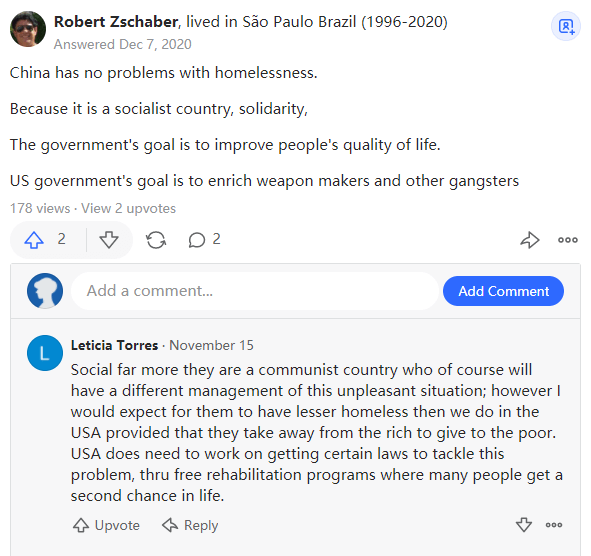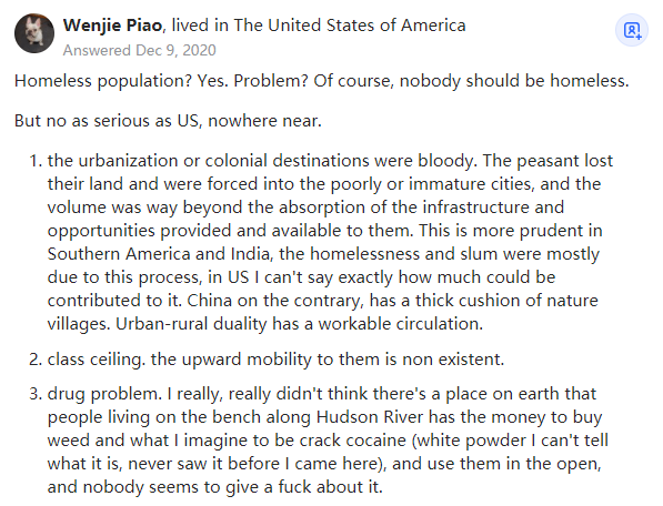 谢谢你经过深入研究的答案。现在我知道为什么我去年访问中国时没有看到无家可归者而我们在我的家乡加州却看到了很多的原因了。