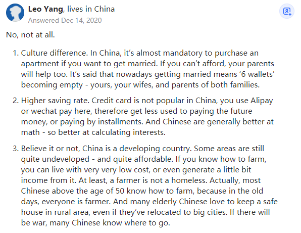 1.文化差异。在中国,如果你想结婚,买房几乎是硬性条件。如果你负担不起,你的父母也会帮助你。据说,如今结婚意味着“6个钱包”变空了——你的、你妻子的以及两个家庭的父母的。2.更高的储蓄率。信用卡在中国不流行,在中国他们一般使用支付宝或微信支付,因此他们不太习惯于透支或分期付款。中国人的数学通常都比较好,所以更擅长计算利息。3.信不信由你,中国是一个发展中国家。中国有一些地区仍然相当不发达,而且生活成本相当便宜。如果你知道如何种田,你可以以非常非常低的成本生活,甚至从中获得一点收入。至少,农民不会是无家可归者。事实上,大多数50岁以上的中国人都知道如何种田,因为在过去每个人都是农民。即使他们已经搬到了大城市,许多中国的老年人也喜欢在农村地区保留一个房子作为保险。如果有战争,许多中国人知道该去哪里。