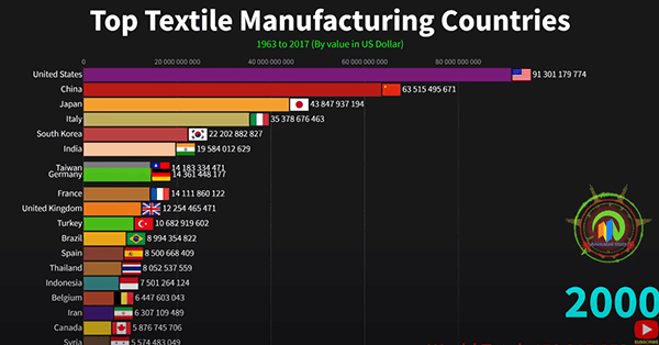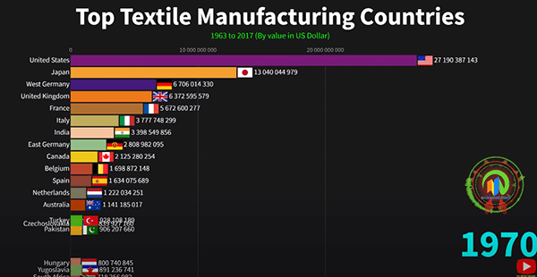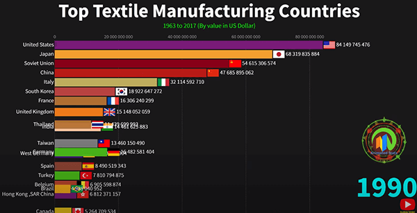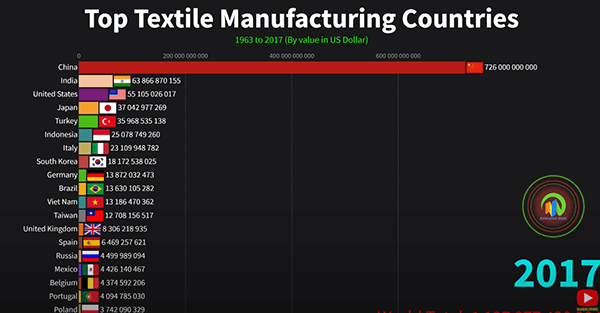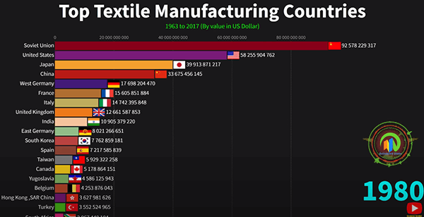 统计数据:1963-2017年世界顶级纺织品制造国 各国网友惊讶于中国统治级的优势本文译自Youtube,因最近部分外国品牌禁用XJ棉花,所以翻译了这篇统计数据视频。该视频统计了从1963年到2017年世界各国的纺织品产量,到2017年,中国纺织品产量已经是排名第二的印度的11倍之多。
