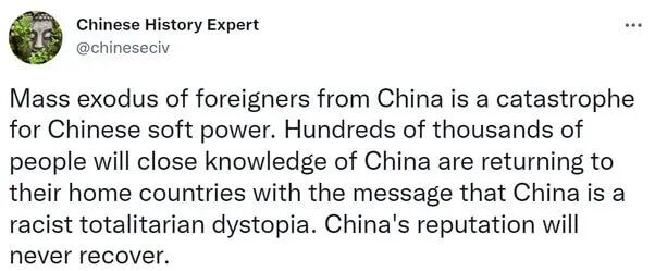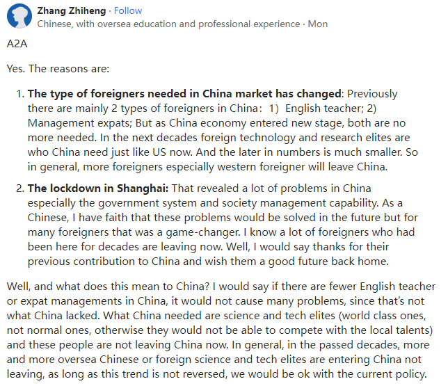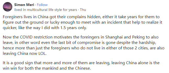 这暴露了中国的许多问题,尤其是政府体制和社会管理能力方面的问题。作为一个中国人,我相信这些问题在未来会得到解决,但对许多外国人来说,这次封城改变了游戏规则。我知道很多在这里待了几十年的外国人现在都要离开了。嗯,我要感谢他们以前对中国的贡献,并祝愿他们在国内有一个美好的未来。