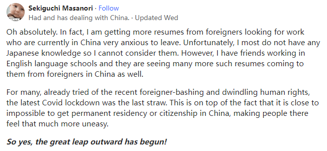 哦,绝对是这样。事实上,我从正在中国寻找工作的外国人那里收到了比以前更多的简历,他们现在非常渴望离开。但不幸的是,他们大多数人都不懂日语,所以我不能考虑他们。然而,我有一些在英语语言学校工作的朋友,他们也收到了更多来自在中国的外国人的简历。
