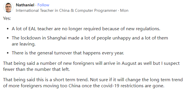 你应该加上“本地化”作为更多的外国人离开中国的一个额外的因素。尤其是在新冠肺炎时代,存在更大的本地化推动力。后来人们发现,使用外国人和本地人没有区别。因此,更多的公司更喜欢本地人,因为本地人更便宜、更合格、更熟悉当地文化等。然而,对外国人离开中国影响最大的是中国不再需要你在回答中提到过的外籍英语教师。