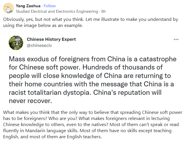是什么让你认为外国人是传播中国软实力的唯一途径?你以为你是谁?是什么让你觉得外国人在向其他人,甚至是向当地人传授汉语知识方面具有相关性?他们中的大多数人无法流利地说或读普通话,他们除了教英语外没有任何技能,而且大多数就是英语教师。