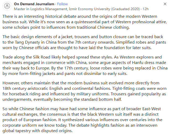 Master in Logistics Management, İzmir Economy University (Graduated 2020),Lives in Turkey1923–present伊兹密尔经济大学物流管理硕士(2020年毕业),1923年至今生活在土耳其关于现代西方商务套装(西装)的起源,有一个有趣的历史争论。虽然它现在被视为西方职业装的典型组成部分,但一些学者指出它受到了中国传统服装的影响。