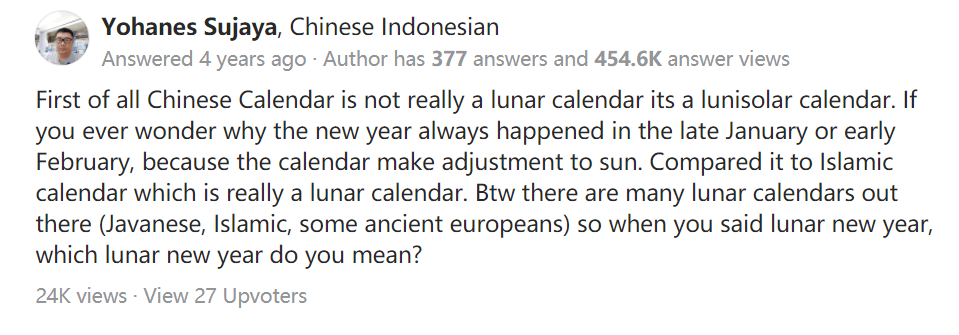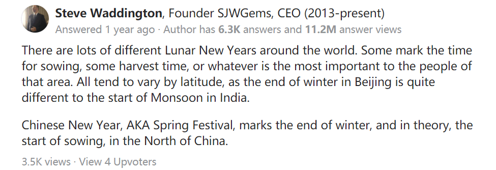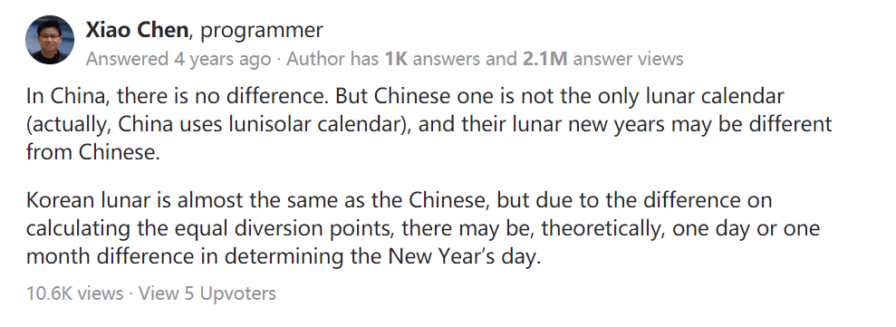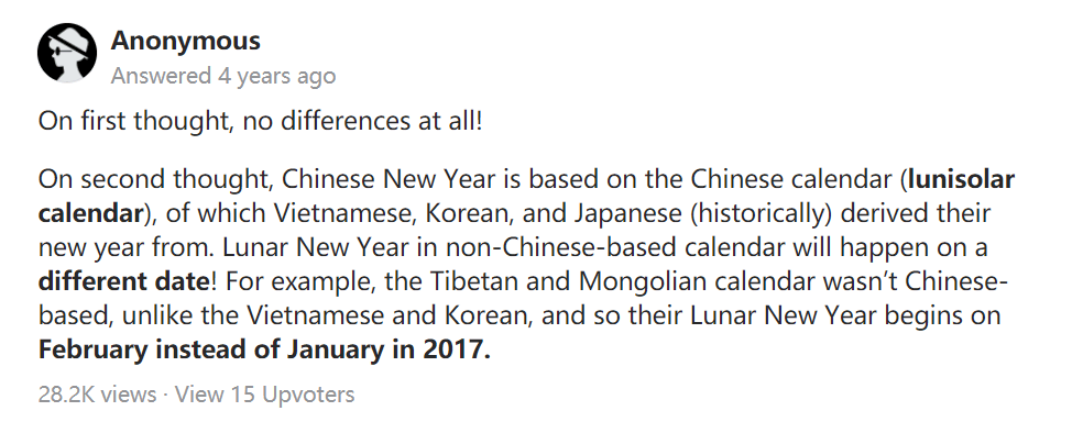 但仔细想想,中国新年是以中国历法(阴阳历)为基础的。越南人、韩国人和日本人的新年(从历史角度)都是从阴阳历中衍生出来的。非基于中国农历的农历新年将在不同的日期举行!例如,与越南和韩国的农历不同,藏历和蒙历就不是以中国农历为基础的,因此他们的新年从2月而不是1月开始。Programmer,Studied at Zhejiang University,Lives in Hangzhou