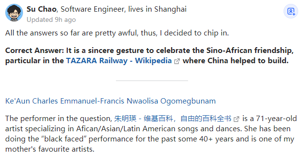 到目前为止,所有的答案都很糟糕,因此,我决定出手。回答正确:这是庆祝中非友谊的真诚姿态,特别是在中国援建的坦赞铁路上。问题中的表演者朱明瑛是一位71岁的艺术家,专攻非洲/亚洲/拉丁美洲歌舞。在过去的40多年里,她一直在做“扮黑脸”表演,她是我母亲最喜欢的艺术家之一。朱明瑛重登2021年央视春晚,她正在表演一个与她在1984年的同一个节目中表演过的非洲歌舞类似的节目。这是朱明瑛在20世纪80年代穿着盛装和2000年左右的时候没有化妆的样子。从前苏联借用来的社会主义的现实主义(Socialist realism)在中国也呼吁庆祝多元文化和国际友爱。中国表演者穿的不是我们自己的文化服装,这是很正常的,“扮黑脸”是类似于“表演方法”之类的东西。中国表演者在表演印度或泰国舞蹈时也经常做类似的化妆。这没有恶意。非洲文化、歌舞最早在冷战时期传入中国,当时中国在外交舞台上寻求国际支持。中国和非洲、亚洲和美洲之间建立的友谊帮助中国在联合国取代了中华民国。中国感谢非洲、亚洲和拉丁美洲的不结盟运动国家兄弟姐妹的友谊。值得一提的是,上述艺术家朱明瑛在上世纪八九十年代曾多次在非洲政要面前进行“扮黑脸”表演。这是朱明瑛再次作为非中文化艺术交流协会主席,与尼日利亚全国文化艺术委员会主席利兹·本女士(Liz Ben)交换礼物。正如我在其他回答中提到的,中国没有基于种族的本土歧视,这只是因为种族的概念对中国来说是陌生的。然而,不幸的是,中国确实存在着长期以来根深蒂固的基于财富和权力的歧视。在中国实行市场经济体制改革后,这种歧视有所抬头。非洲黑人在中国受到歧视,是因为他们被认为是穷人,而不是因为他们是黑人。没有中国人会歧视迈克尔·乔丹、威尔·史密斯或迈克尔·杰克逊。事实上,有不少中国人崇拜他们。感谢诸位亲的相伴与支持,由于个别文章的用词和地图使用不规范,全部文章会在审核整理之后陆续上架,新翻译的文章会特别标注,未做标注的为发布过的文章。为避免误点收费文并祝大家新年快乐,所有1月17日之前注册的用户均已获赠1000花瓣,敬请查收。每日登陆送5花瓣 | 联系方式:QQ-1399710240 ,有任何问题请发邮件或者加QQ。
