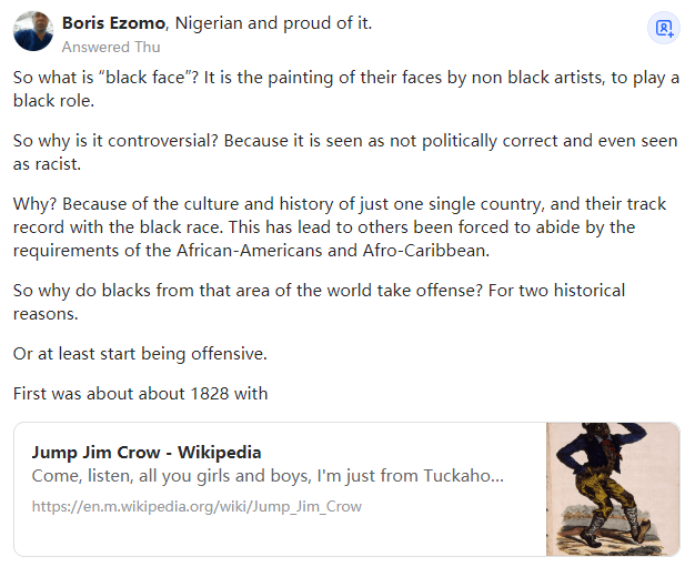 我以非洲人的身份在说话,尽管我一点也不觉得冒犯,但我认为,如果中国人穿着自己的衣服像我们一样跳舞,而不涂黑脸,这种荣誉会更大。我们看到过很多非洲人在跳非洲舞,但我们从来没有看到中国人跳非洲舞。所以当我同情非洲裔美国人的苦难和争取平等权利的时候,我反对他们试图告诉所有和他们的过去无关的人(包括非洲人自己)要如何表现。涂黑脸是一种戏剧化妆形式,主要由非黑人表演者用来讽刺黑人。我不喜欢任何人滑稽地描述我的肤色或种族。在戏剧表演中,有无数种方法可以不用这些滑稽动作。最好的情况是,他们扮黑脸是由于无知(就像加拿大总理特鲁多或其他年轻人的胡闹)。最坏的情况是吉姆·克劳这样的。但是,以他人为代价来胡闹并不酷,所以即使是无知也不足以成为借口。译注:吉姆·克劳是美国剧作家T.D.赖斯于1828年创作的剧目中的一个黑人角色的名字,后来逐渐变成了贬抑黑人的称号和黑人遭受种族隔离的代名词。夸大某人的某些显著的特征,以产生滑稽或怪诞的效果的图画,描述或模仿。所以你们所做的是声称每个把他们的脸涂成黑色的演员或人都是在嘲笑黑人,而在我提到的两个例子中,没有人在嘲笑任何人。滑稽描绘(Caricature)既可以是侮辱,也可以是奉承。在吉姆·克劳时代,当白人演员涂着黑脸,表现得像个白痴时,这就是种族主义的终极形式。表演不是现实,而是建立在现实的基础上。我同意,演员应该有表达自己创作部分的自由,但不能以牺牲真实的人的利益为代价。别跟我胡说八道扮演黑人演员的事了,扮黑脸可不是为了塑造黑人演员。如果你没有黑人演员来演你想演的节目,那么最好不要演。中国的这些节目的观众是谁?其他中国人。那为什么要扮黑脸?我并没有对此感到愤慨,我只是说,扮黑脸并不是什么天真的表演选择,它往往意味着嘲笑,无论它多么微妙。不管美国的历史如何,扮黑脸从来不是为了讨好黑人或使黑人更具吸引力。你重复你的论点时又假设每个扮黑脸都是滑稽描绘(Caricature)。你想再读一遍什么是滑稽描绘(Caricature)吗?你的整个论点都是基于美国文化所呈现的印象。不如你告诉我们,从你的文化角度来看,“Seun”这个词是怎样解读的。