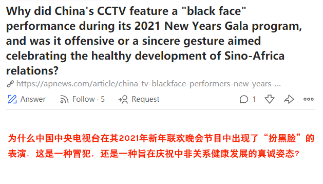 2021年央视春晚中再次出现“涂黑脸”表演引发种族歧视争议,网友如何看待这一争议?本文译自Quora,原标题:Why did China's CCTV feature a "black face" performance during its 2021 New Years Gala program, and was it offensive or a sincere gesture aimed celebrating the healthy development of Sino-Africa relations?