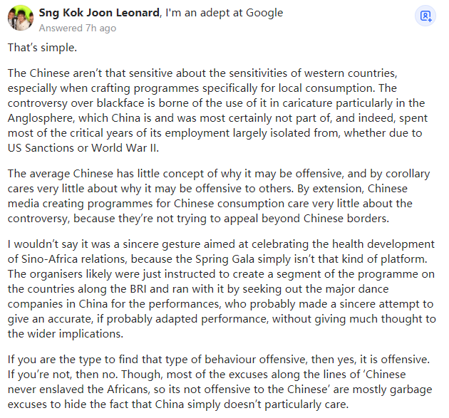 中国人对西方国家的禁忌并不那么敏感,尤其是专门针对当地人的禁忌。关于扮黑脸的争议源于它在滑稽描绘(Caricature)中的使用,尤其是在英语圈,但中国现在和过去肯定都不是英语圈的一部分。事实上,由于美国的制裁,中国在发展的关键时期大部分时间都与之隔绝。普通中国人几乎不知道为什么扮黑脸会冒犯别人,因此也就很少关心为什么它会冒犯别人。推而广之,为中国消费者制作节目的中国媒体也很少关心这一争议,因为他们的节目传播并没有试图超越中国的边界。我不会说这个节目是一个旨在庆祝中非关系的健康发展真诚的姿态,因为春晚根本不是这样的平台。主办方可能刚刚接到指示,要制作一个关于“一带一路”沿线国家的节目片段,并通过寻找中国的主要舞蹈公司来进行演出,这些舞蹈公司可能真诚地试图提供准确的演出,但没有考虑到更广泛的影响。如果你是那种认为这种行为是令人厌恶的人,那么是的,它是令人厌恶的。如果你不是,那么就不是。尽管如此,大多数类似于“中国人从未奴役过非洲人,所以对中国人来说这并不冒犯”的借口都是垃圾借口,用来掩盖中国根本没有特别在乎的事实。因为这肯定是种|族主义的,主要是因为我们中国人有很深的歧|视性。中国人有一个习惯,歧视不在他们的直接社交圈子里的人,你离它越远,歧视就变得越随意。这是我们在文化上预设的交易关系的副作用,我们需要付出很多努力来纠正这一点。因此,如果不做任何努力,它就会像暴风雨夜晚的灯塔一样闪耀。实际上,我很好奇非洲人是否觉得这很无礼。我想埃及人应该会高兴的,因为他们的地区和非洲是分开的,而中国人没有给他们涂黑脸。
