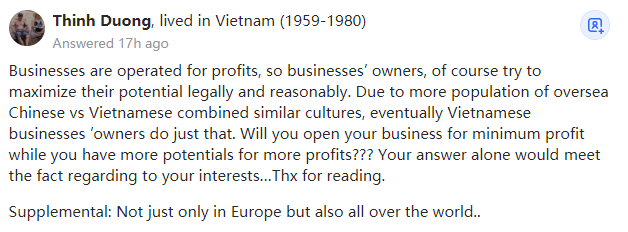 来源:https://www.quora.com/Vietnamese-are-always-proud-of-Vietnamese-food-and-cuisine-for-instance-Pho-Banh-M%C3%AC-But-why-are-most-oversea-Vietnamese-business-people-in-Europe-running-their-restaurants-under-the-name-Chinese-restaurant-Why