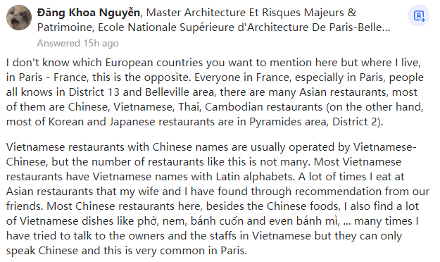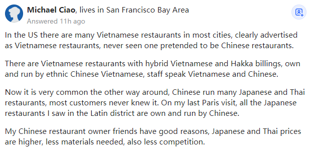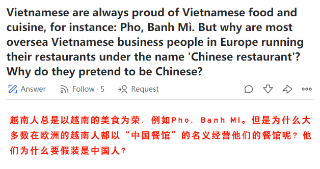 本文译自Quora,原标题:Vietnamese are always proud of Vietnamese food and cuisine, for instance: Pho, Banh Mi. But why are most oversea Vietnamese business people in Europe running their restaurants under the name 'Chinese restaurant'? Why do they pretend to be Chinese?