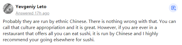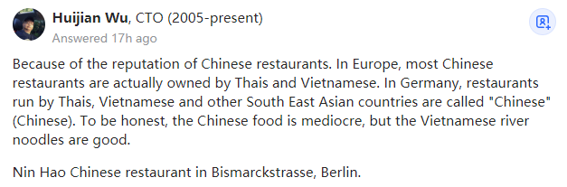 首席技术官(2005年至今),2001年至今生活在香港因为中国餐馆的名气。在欧洲,大多数中国餐馆实际上都是泰国人和越南人开的。在德国,泰国人、越南人以及其他东南亚人经营的餐馆都被称为“中国餐馆”(Chinese)。说实话,他们出售的中国菜一般,但越南河粉还不错。越南人开的中餐馆很容易辨认,你进去看看菜单,如果上面有越南河粉,店主一定是越南人。无论越南民族主义者怎么争辩,欧洲绝大多数越南餐馆都被称为“中国餐馆”而不是“越南餐馆”。这是一个不容否认的事实。如果你不相信我,你可以在欧洲亲眼看看。在欧洲,“中国”餐馆由东南亚人拥有,而“日本”餐馆则是中国人开的。在德国,大多数日本餐馆都有越南老板,很少有日本餐馆有真正的日本老板。越南人甚至还经营泰国餐馆。在美国佛罗里达州,几乎每家寿司店都是泰国人开的。很遗憾,他们对如何制作真正的日本寿司一无所知。在澳大利亚,韩国人经营日本寿司店/回转寿司,马来西亚华人经营中国广东餐馆,越南人经营自己的餐馆,一些老挝人/中国人经营泰国餐馆。同样的事情也发生在中国。大多数兰州拉面店的老板是青海人而不是甘肃人或兰州人。北京、上海等地的云南餐馆大多不是云南人所有,菜单上的很多菜都是这些老板自创的,在云南找不到。一切都是为了生意,不是为了美食!你知道的,中国游客在欧洲是一个庞大的数字,他们就是目标客户。在澳大利亚,大多数日本餐馆的老板都是中国人,中国人用他国的名菜赚钱。