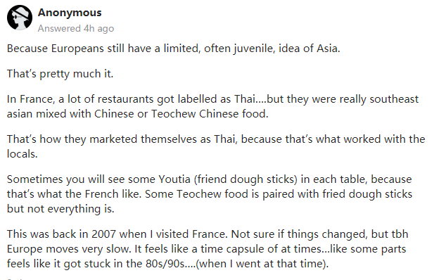 在法国,很多餐馆都被贴上了泰国的标签……但它们实际上是混合了中国菜或潮州菜的东南亚菜。有时你会在每张桌子上看到一些油条,因为法国人很喜欢。有些潮州菜会和油条搭配,但不是所有的菜都是。这些都是我在2007年访问法国的时候看到的,不确定情况是否发生了变化。但欧洲的发展非常缓慢,有时感觉像是一个时间胶囊…有些部分感觉像是卡在了上世纪80/90年代…(当时我去的时候)。lived in Vietnam (1959-1980)