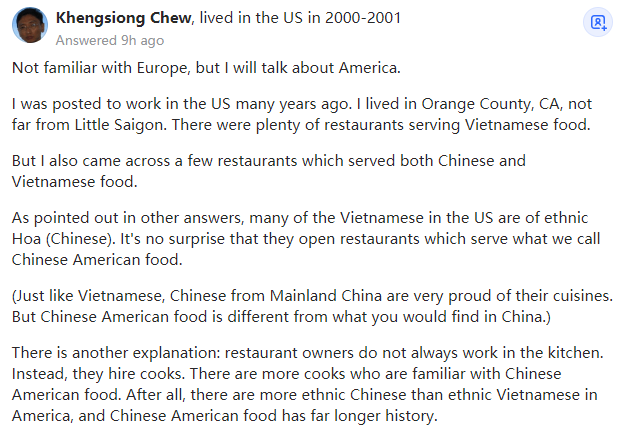 很多年前我被派到美国工作,我住在加州奥兰治县,离小西贡不远,那里有很多餐馆供应越南菜。正如其他答案所指出的,许多在美国的越南人是华裔,所以毫不奇怪,他们开的餐馆供应着的就是我们所说的美式中餐。(和越南人一样,中国大陆的中国人对自己的菜系非常自豪,但是美式中餐和中国的中餐是不同的。)还有另一种解释:餐馆老板并不总是在厨房工作,相反,他们会雇佣厨师。熟悉美式中餐的厨师更多,毕竟在美国,华人比越南人多,而且美式中餐的历史要长得多。lives in San Francisco Bay Area