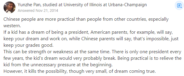 studied at University of Illinois at Urbana-Champaign中国人比其他国家的人(尤其是西方人)更现实。例如,如果一个孩子有当总统的梦想,美国父母会说:“坚持你的梦想,继续努力。”而中国父母会说:“那不可能,只要保持好成绩就行了。”