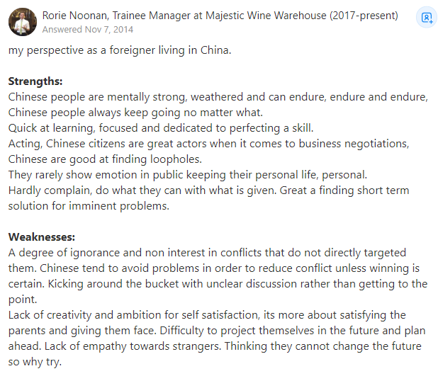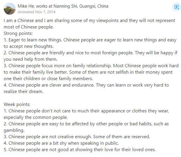 来源:https://www.quora.com/What-are-strengths-and-weaknesses-of-Chinese-people-1