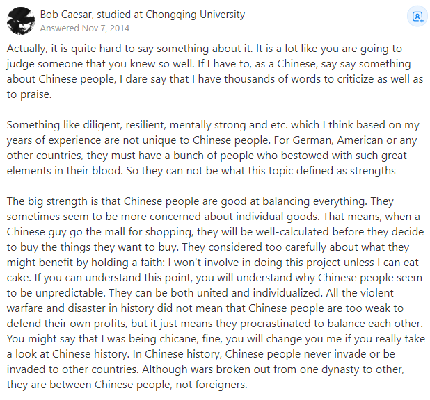 勤奋、坚韧、精神强大等等并不是中国人所独有的,我认为这是基于我多年的经验来判断的。对于德国、美国或任何其他国家来说,他们一定也有一群血液里也流淌着如此伟大的元素的人,所以它们不能作为这个主题所定义的优点。中国人最大的优点是善于权衡利弊,他们有时似乎更关心个别商品。这意味着当一个中国人去购物中心购物时,他们在决定买他们想买的东西之前会经过深思熟虑。他们对于能获得什么好处往往会考虑再三,他们有个信念:除非我能吃蛋糕,否则我不会参与这个项目。如果你能理解这一点,你就会理解为什么中国人似乎是不可预测的。他们可以是统一的,也可以是个性化的。历史上所有的暴力战争和灾难并不表示中国人民软弱到无法捍卫自己的利益,这只是意味着他们为了平衡彼此在拖延。你可能会说我很叛逆,好吧,如果你真的看过中国历史,你会改变想法。在中国历史上,中国人民从来没有被侵略或侵略过其他国家。虽然战争从一个朝代爆发到另一个朝代,但战争发生在中国人之间,而不是和外国人。传统中国哲学里的“和“我认为很好地总结了中国人的好和坏,它可以被翻译成“和谐”,它就像薛定谔的猫,不管它是好是坏,一切都取决于你如何看它,观察它,判断它和定义它。