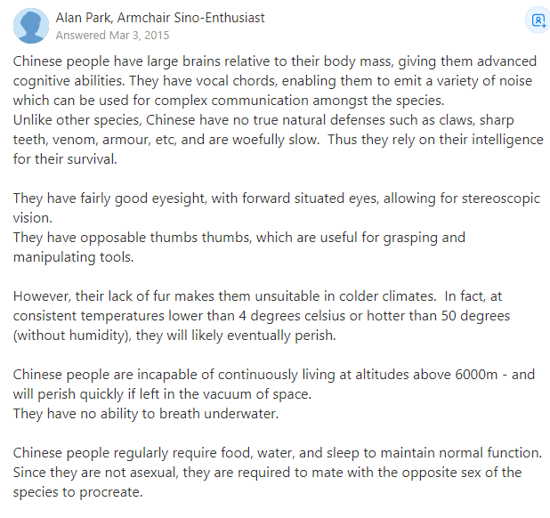与其他物种不同,中国人没有真正的自然防御能力(如爪子、锋利的牙齿、毒液、盔甲等),而且速度慢得可怜。因此,他们只能依靠自己的智力生存。他们的视力相当好,眼睛朝前,有立体视觉。他们有对生的拇指,这对抓取和操纵工具很有用。然而,他们缺乏皮毛,这使得他们不适合在寒冷的气候下生活。事实上,如果温度持续低于4摄氏度或高于50摄氏度(不含湿度),他们最终很可能会死亡。中国人缺乏在6000米以上的高空持续生存的能力,如果被留在太空的真空中,他们很快就会死亡。他们在水下没有呼吸能力。由于他们不是无性的,所以他们必须与该物种的异性交配才能繁殖。