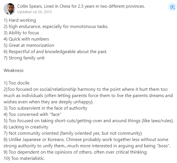 Lived in China for 2.5 years in two different provinces.2)过于注重社会/人际关系的和谐,以至于对他们个人造成了极大的伤害(即使他们非常不开心,也想要实现父母迫使他们去实现的梦想和愿望)。7)不以社区为导向(只以家庭为导向但不以社区为导向)。8)不像日本人和韩国人,中国人在没有强大的权威统一他们的情况下,可能很少会合作…他们对争论和成为“老板”更感兴趣。。