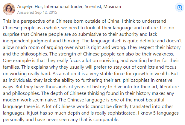 International trader, Scientist, Musician这是一个出生在中国以外的华人的观点。我认为,要把中国人作为一个整体去理解,我们需要看看他们的语言和文化。中国人民如此屈从于他们的权威,缺乏独立的判断和思考,这并不奇怪。
