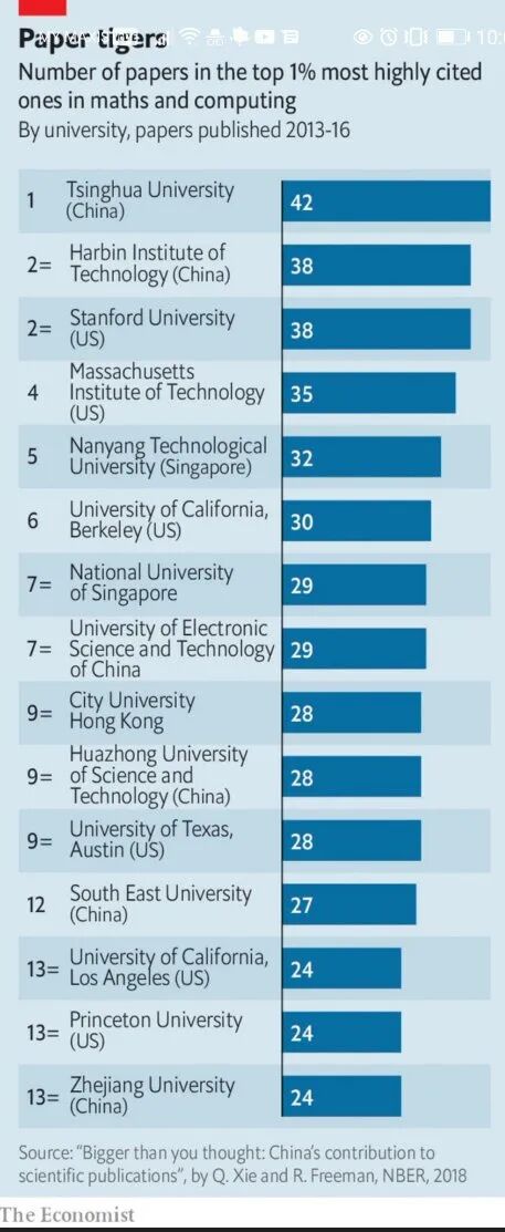 两者并非相互矛盾。在中国,一大批平凡的学者与一批精英研究人员共存是完全可能的。作为部分佐证,以下是数学和计算领域的一个论文引用排名:《泰晤士报高等教育》(The Times Higher Education)的排名更具通用性并考虑了非研究因素以及非自然科学研究。尽管中国的大学在这个榜单上排名不高,但在过去的几年里,编辑们也评论了中国大学发展的速度有多快。中国确实取得了很大的进步,但是他们的人口仍然是我们的4.26倍。